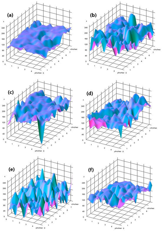 Topography of samples, successively: (a) Mg_02, (b) Mg_05, (c) Mg_01, (d) Mg_04, (e) Mg_03, (f) Mg_06.
