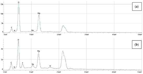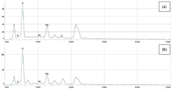 The elemental composition of implants with a chitosan (10–120 cps) coating, successively: (a) Mg_01, (b) Mg_04.