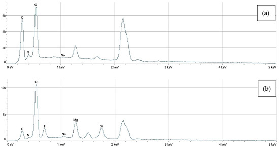 The elemental composition of implants with a chitosan (100–300 cps) coating, successively: (a) Mg_02, (b) Mg_05.