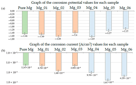Comparison of the obtained results: (a) corrosion potential graph for each sample (b) corrosion current graph for each sample.