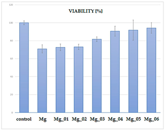Each sample group (n = 3) was tested in triplicate wells. The control group was standardized to 100% viability. Among coated samples, Mg_06 demonstrated the highest cell viability at 94.8% ± 1.5, followed by Mg_05 (89.4% ± 1.9) and Mg_04 (85.1% ± 2.3). Samples Mg_01–Mg_03 showed lower viability (~70–79%), with uncoated Mg not included due to known cytotoxicity. The difference between Mg_06 and Mg_01 was statistically significant (p < 0.01), confirming that the PEO + PDA combination most effectively mitigated Mg-related cytotoxic effects. These results align with the literature indicating that PDA supports osteoblast adhesion by mimicking extracellular matrix interactions [45,46,47], and the PEO barrier reduces ion flux and pH shifts that impair cell viability.