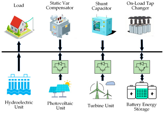 - Lu, Y.; Lu, C.; Liu, Y.; Deng, M.; Chen, Y.; Duan, R. A multi-objective coordinating model for distribution network with EVs, energy storage, and reactive power compensation devices. Energy Rep. 2024, 12, 2600–2610. [Google Scholar] [CrossRef]