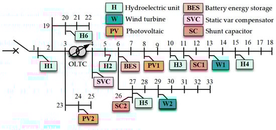 - Parameter initialization. Input system network structure parameters and load predicted power, wind power and PV predicted power, the hydroelectric unit parameters, etc., and then set the iteration count: g = 1;