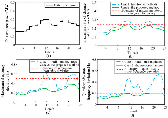 - Compared with Case 1, the method proposed in this paper additionally considers dynamic frequency security constraints. Although this leads to a 3.1% increase in economic costs, the system’s upward reserve capacity is 29.97% higher than that of Case 1, and the inertia constant is 19.24% higher, effectively improving the system’s frequency security.