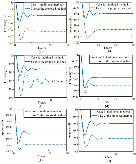 - Compared with Case 3, the BES frequency regulation strategy with adaptive virtual droop coefficients proposed in this paper fully considers the SOC safety and primary frequency regulation capability. It enables the BES to dynamically adjust its own SOC value according to the system’s frequency regulation requirements, avoiding the SOC from exceeding the safe range due to rapid frequency regulation by the BES;