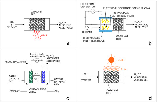 It should be noted that compared to the steam reforming reaction, dry reforming also has the distinction of obtaining a lower H2 to CO ratio, which is useful for obtaining syngas, which can be directly used in chemical synthesis without post−treatments. The steam and dry reforming reactions can finally also be applied to higher hydrocarbons and are, for example, also utilized for the abatement of tar from biomass gasification [,,]; however, the high temperature requirements of the reaction and the subsequent deactivation of catalysts due to sintering and coke deposition remain great issues in the implementation of the process. Several alternatives in terms of catalyst support, dopants, promoters, and structure have, thus, been investigated to improve reactant conversion and limit poisoning [,,,,,,,,]. In recent years, interest in alternatives to conventional thermochemical processes, such as plasma reforming [], electrochemical reforming [], and photocatalytic reforming [], has also significantly grown, as briefly reported in Figure 1. In conventional thermochemical processes (Figure 1a), the energy required for the reaction is provided in the form of heat by operating at a high reaction temperature. On the other hand, the alternative processes employ a variety of strategies to decrease the temperature of operation: plasma reforming (Figure 1b) utilizes high−voltage electrodes integrated in the reactor design to produce an electrical discharge in the gas phase that causes the formation of plasma with a high electron temperature, which then activates methane and oxidant molecules by forming radical and ionized species which then interact over the catalyst surface [,]. Electrochemical processes (Figure 1c) also use electrical current and difference in electrical potential to provide the oxidation of methane and the reduction of the oxidant over the electrodes of a liquid phase or solid phase fuel cell, but they do not involve the formation of plasma and the charge is instead transferred through the diffusion of ions in a liquid or solid media between electrodes. Finally, photochemical processes (Figure 1d) make use of light to provide the energy required for reactant activation. Photocatalytic processes, in particular, can provide very eco−friendly pathways for chemical conversion, especially if directly driven by sunlight [], and, in recent years, have been studied for a vast number of applications, ranging from wastewater treatment [] to chemical synthesis []. The use of photocatalysis can enable forming reactions in much milder conditions compared to conventional thermochemical processes, lowering CO2 emissions and limiting problems, such as catalyst sintering []. Compared to conventional thermal processes and to electrochemical processes, the photocatalytic approach has the fundamental advantage that, through the activation of chemical bonds by photoexcited electrons, it is possible to drive uphill reactions against thermodynamic restrictions, as the mechanism of reaction is completely changed, allowing researchers to potentially bypass thermodynamic equilibriums [,,]. This advantage is shared with the plasma−reforming processes, where the excited electrons of the non−thermal plasma can also activate chemical bonds; however, photocatalysis has the advantage of not requiring plasma generation, which is an energy intensive process [,,].