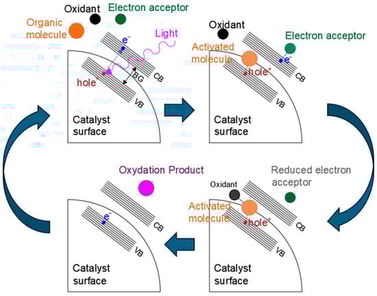 An example of a typical photocatalytic mechanism [,] for organic compound photooxidation on a semiconductor catalyst is shown in Figure 2.