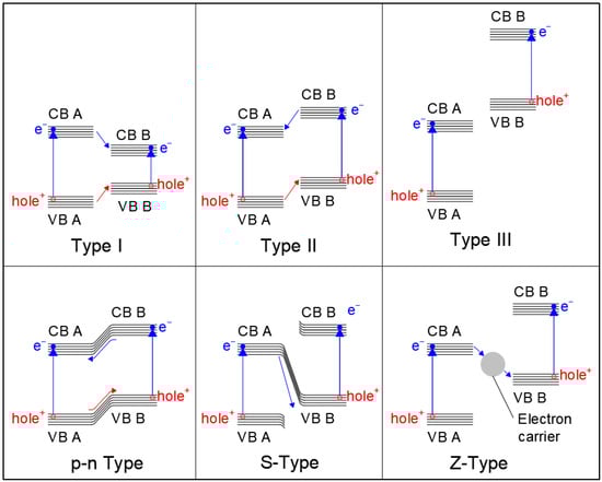 The type of heterojunction strongly affects the activity of the photocatalyst: type 1 and 3 heterojunctions, for example, cannot inhibit electron–hole recombination, since in the former, both electron and holes tend to migrate in the same direction, while in the latter, diffusion of both electrons and holes is inhibited by the band gap incompatibility of the semiconductors. Thus, type 2, S−scheme, Z−scheme, and p−n type band gaps are the most relevant for photocatalytic applications, with S−scheme and Z−scheme materials attracting much interest due to their superior charge separation ability.