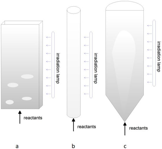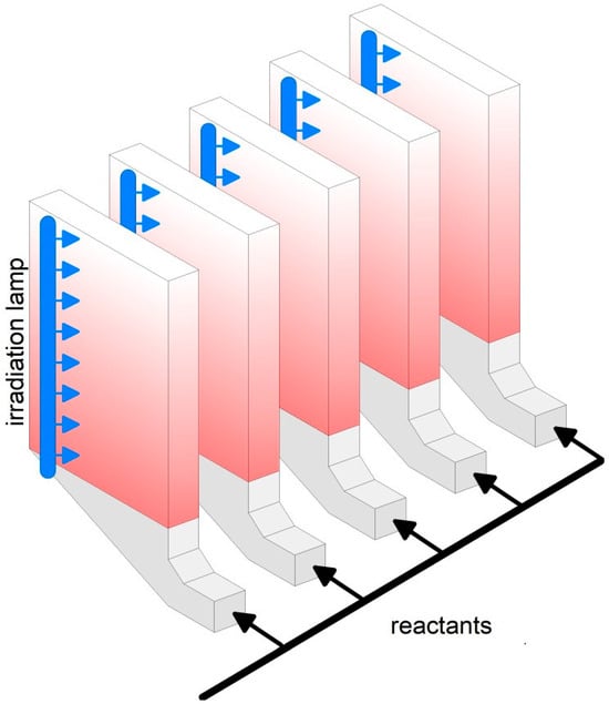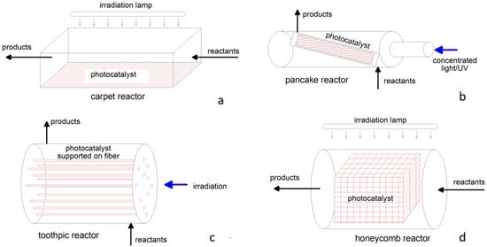 Conversely, a typical photoreactor has a planar or two−dimensional geometry, like in the “carpet”, “pancake”, “toothpick”, and “honeycomb” schemes reported in Figure 4 [], with a transversal or longitudinal irradiation. The photocatalyst powder is dispersed and fixed over a suitable support that can be easily irradiated by natural or artificial light. The reactant is in contact with the catalyst mainly by a rather laminar flow, resulting in poor process intensification. Apart from reactions occurring in liquids, this configuration is suitable for the removal of pollutants from the environment, e.g., indoor air purification []. Photocatalytic CO2 reduction by steam has recently been addressed at laboratory−scale or modelled, demonstrating the possibility of distributed H2 production, even with solar irradiation [,].