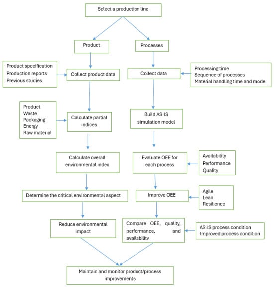 The methodology to achieve the objectives of this research is depicted in Figure 1. Initially, the key production line is selected based on production experience with processes that need significant improvement to achieve the firm’s goals. Next, the main product is chosen, and the relevant technological processes are mapped. Data collection for processing times, handling characteristics, and product specifications is performed. Evaluation of the OEE at the current process conditions and assessment of the environmental impacts for five environmental profiles based on the existing product characteristics are then conducted. Improvement opportunities are then identified for manufacturing processes and products. Finally, appropriate improvement actions utilizing the practices of lean, agile, resilient, and CP are conducted, and then improvements in process OEE and environmental performance are assessed. Finally, improvements are implemented and maintained.