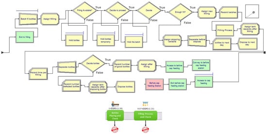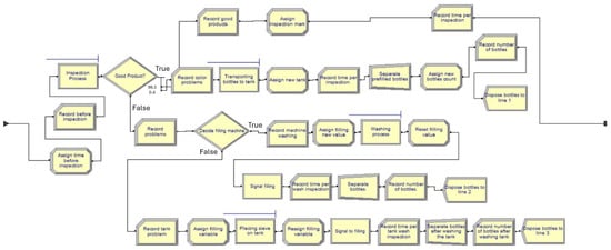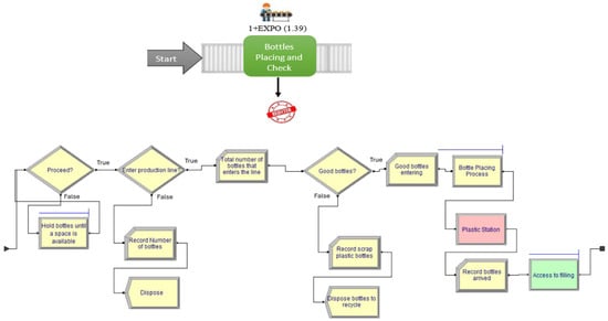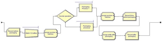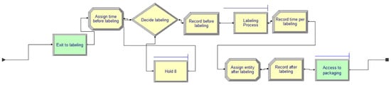 The simulation model for the labeling process is depicted in Figure 8. Two stoppages occur as the label roll must be changed every 3456 bottles. The process mean time to failure and downtime are 2 h and 5 min, respectively.