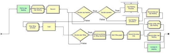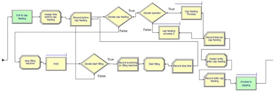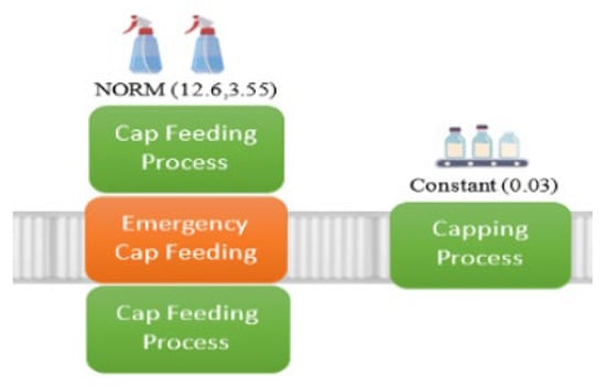 The cap-feeding process is shown in Figure 5 and requires two operators who place and screw caps. The processing time follows a normal distribution NORM (12.6, 3.55). For every 396 bottles, the process stops temporarily for 40 s while a new box of caps is bought. When the process queue reaches 18 bottles, the filling machine stops.