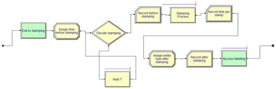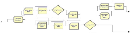 The inspection sub-model is constructed, as shown in Figure 11. The box inspection is performed by one inspector every 20 min with an inspection time of 45 s.