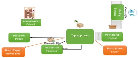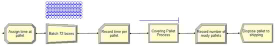 After the boxes are taped and inspected, they proceed as shown in Figure 12 to the pallet at the end of the production line with a transfer time defined as TRI (2, 3, 5) seconds. Each pallet contains 72 boxes wrapped securely. This process is performed manually and takes 3 s. Completed pallets are then transported to the finished goods warehouse.