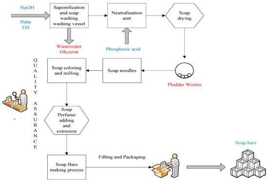 The environmental assessment for the soap production line is conducted as follows [17]. The basic components of the soap bar are as follows: (1) fats and oils, including palm oil, palm stearine oil, palm kernel oil, and coconut fatty acids; (2) sodium hydroxide (NaOH), also known as caustic soda; and (3) sodium chloride (NaCl). The basic formulations of soap are as follows: