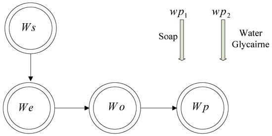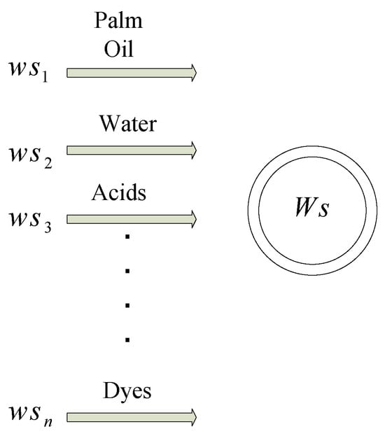 The raw material profile for the soap product, as shown in Figure 14, comprises quantitative data related to all raw material flows, including primary raw materials, auxiliary raw materials, and water used in technological processes. Let Ws and wsi denote the raw material unit index and the partial raw material unit index for the primary raw material i, respectively.