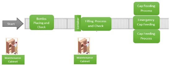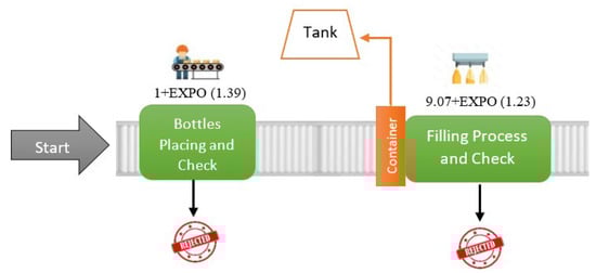 The detergent material is stored, as shown in Figure 4, in a tank with a 10,000 L capacity. The filling machine has six nozzles to fill six bottles concurrently. The processing time data for filling bottles is modeled as 9.07 + Exponential (1.23) seconds. A sensor failure occurs every 24 h and requires a 10-min fix.