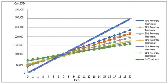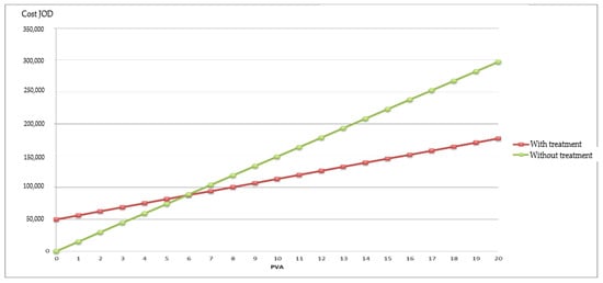 The feasibility of applying a treatment solution to the wastewater generated by the saponification process is assessed through a comparison between a system that operates without wastewater treatment (Case 1) and a system that includes wastewater treatment with a specified recovery rate (Case 2). The payback period for the treatment system is defined as the period necessary to cover the cost of installing and operating the treatment system through the savings acquired from the usage of the treated water. For Case 1, the clean water consumption is 44 m3 per day, and the waste discharge is 36 m3. For Case 2, the treatment system recovers a specified percentage of the waste discharge and reuses it. Knowing that the daily water consumption cost for Case 1 is (JOD 1.1/m3 × 44 m3/day) = JOD 48.4/day, which is equal to JOD 14,858.8/year. On the other hand, Case 2 indicates a considerable reduction in the purchasing cost of clean water, due to the different water recovery rates from the treatment center, as shown in Figure 25. For example, a 40% recovery rate produces 14.4 m3 of treated water, and the cost of the purchased water will be (JOD 1.1/m3 × 29.6 m3/day) = JOD 32.56/day. The yearly water consumption cost for Case 2 is (32.56/day × 307 days) = JOD 9995.92/year. Figure 26 displays the annual cost versus present value of an annuity (PVA) at a recovery rate of 70%, where a significant reduction in annual cost will be gained by installing the proposed water treatment system.