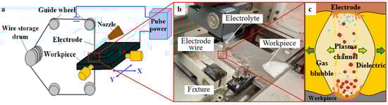Mixed-powder WEDM is a special processing method based on traditional WEDM cutting by adding a conductive or semi-conductive micro-nano-powder (e.g., graphene, silicon carbide, aluminum, etc.) to the working fluid to enhance the processing performance [14]. The processing principle is: that under the action of a pulsed-power supply, a high-frequency discharge channel is formed between the electrode wire and the workpiece, and the mixed-powder particles in the working fluid are vaporized and ionized under the high temperature of the discharge to form a plasma, which increases the discharge gap and expands the discharge channel to improve the energy distribution [15]. Graphene nanoparticles can reduce the breakdown voltage and stabilize the discharge plasma due to their ultra-high specific surface area and excellent electron mobility, significantly improving the discharge efficiency. Mixed-powder particles accelerate the discharge of etching products by enhancing the thermal conductivity of the working fluid while dispersing the discharge points to make the energy distribution uniform and reduce the surface microcracks. Experiments used Hangzhou Huafang CNC machine tool Co., Ltd.’s (Hangzhou, China) HF320MZQ-G20 type in the wire WEDM cutting machine. The processing taper range is ±6°, with an octagonal cutting precision of ≤0.005 mm. The surface roughness, after multiple cuts, can reach Ra ≤ 1.0 μm. In terms of performance, the maximum cutting efficiency of this machine tool is ≥180 mm2/min, maintaining continuous processing of 400,000 mm2 at a cutting speed of 110 mm2/min. Its principle of operation and processing site are shown in Figure 1a–c for the discharge channel micrograph.