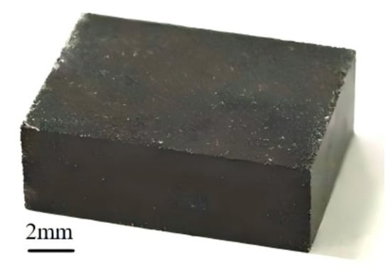 Aluminum-based silicon carbide (SiCp/Al) composites have become a key material in aerospace, automobile manufacturing, and other high-end equipment fields due to their excellent mechanical properties (high hardness, high wear resistance) and unique thermophysical properties (low coefficient of thermal expansion) [16]. In this paper, aluminum matrix composites reinforced with low-volume-fraction silicon carbide particles (SiCp/Al) were used as experimental materials, where the volume fractions of the SiC particles and Al matrix were 20% and 80%, respectively. The geometry of the specimens used for the experiments was 160 mm × 130 mm × 10 mm, and the size of the cut specimens was 10 mm × 10 mm × 3 mm, as shown in Figure 2. The main physical property parameters of SiCp/Al composites are listed in Table 1. In addition, a Dick’s-brand-water-based working fluid was selected as the conventional working fluid, and graphene nanopowder was selected as the dielectric additive.