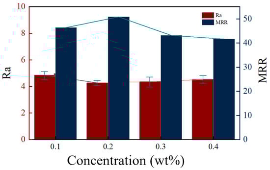 In order to clarify the influence mechanism of the graphene working solution concentration, the baseline process parameters (Ton = 22 μs, DC = 1:4, PT = 3, WS = 2 steps) were selected for the control experiment. The experimental results are shown in Figure 3, where it can be observed that the effects of different concentrations of the aqueous graphene working fluid on Ra and MRR show a tendency of first increasing and then decreasing. Specifically, when the graphene concentration increases from 0.1% to 0.2%, the Ra value decreases and the MRR value increases, while when the concentration exceeds 0.2%, the Ra value starts to increase, and the MRR value decreases. For MRR, the reason for the appearance of this trend is that, the increase in the graphene concentration is accompanied by a change in the viscosity of the working fluid, and the desirable viscosity can improve the cooling and chip removal ability of the machining fluid, which can improve the MRR [19]. However, a too-high viscosity may hinder the flow of the machining fluid, affecting the cooling and chip removal effects and leading to a decrease in the MRR. For the Ra, graphene acts as a lubricant during the machining process and optimizes the discharge channel, thus reducing the Ra [20]. However, when the concentration is too high, graphene flakes may produce aggregation, leading to an increase in the Ra.