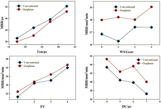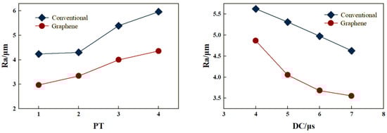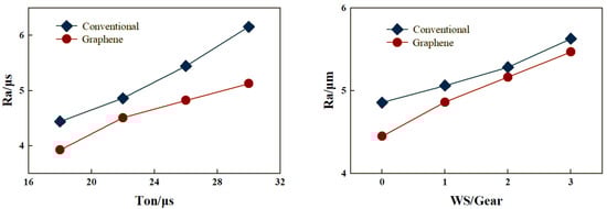 According to the experimental design, one-factor comparative experiments were carried out using the ordinary working fluid and the graphene mixed-powder working fluid (wt%), respectively, to investigate the effects of the process parameters, such as pulse width (Ton), duty cycle (DC), number of power tubes (PT), and wire-walking speed (WS), on the MRR and Ra. The effects of different working fluids on the MRR and Ra after processing are shown in Figure 5 and Figure 6, respectively.