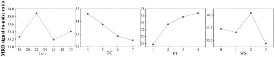 The mean values of the MRR signal-to-noise ratios of the four groups of tests corresponding to each level of each factor were calculated and plotted in Figure 7 of the mean values of the MRR signal-to-noise ratios. Figure 7 shows that the S/N fluctuates with the increase in the Ton; the MRR tends to decrease with the increase in DC; the MRR increases and then tends to be stable with the increase in PT; and the MRR decreases, then increases, and then decreases when the increase in WS is observed. The range of changes in the mean values of the signal-to-noise ratios of the PT was the largest, which shows that the PT have the greatest influence. It is analyzed that the PT determines the energy intensity of a single pulse, and a higher PT means more energy release, which can melt the material faster and thus increase the MRR. Based on the levels corresponding to the maximum of the mean values of the signal-to-noise ratios of the factors, the combination of the processing parameters at the time of the maximum of the MRR is determined as follows: Ton = 22 μs, DC = 1:4, PT = 4 s, and WS = 2.