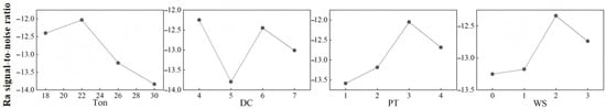 The mean values of the Ra signal-to-noise ratios of the four groups of tests corresponding to each level of each factor were calculated separately, and the mean values of the Ra signal-to-noise ratios were plotted in Figure 8. From Figure 8, it can be seen that the S/N showed a decreasing trend with the growth in the Ton; with the increase in DC, the S/N first decreased, then increased, and then decreased; with the growth in the PT, the S/N increased and then decreased; and with the increase in WS, the S/N increased first and then decreased. And from the figure, it can be seen that the range of variation in the mean value of the Ton signal-to-noise ratio is the largest, indicating that the Ton has the greatest influence on Ra. It is analyzed that a higher Ton produces a larger discharge pit, leading to an increase in Ra. Therefore, the higher the Ton, the more pronounced the Ra. The level corresponding to the maximum value of the mean value of the signal-to-noise ratio of each factor material was selected to form the processing parameter combination at the time of the maximum Ra. The processing parameter combinations were as follows: Ton = 22 μs, DC = 1:4, PT = 3, and WS = 2.