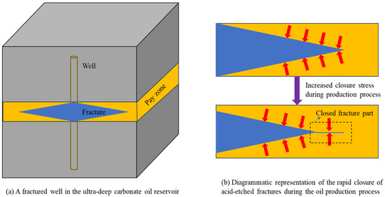 As global oil and gas exploration and development advance towards deep strata, the development of UDCRs is increasingly attracting research interest. UDCRs have characteristics of high temperature, high pressure, and complex rock mechanical properties [1,2], and their development faces many challenges, among which the creep and stress sensitivity problems are particularly prominent. During the production process of UDCR oil wells, carbonate rocks exhibit significant time-dependent deformation characteristics under high-temperature and high-pressure environments, and artificial fractures will creep, resulting in the fractures gradually closing (Figure 1). After carbonate rock acid-etching, the mechanical properties of the rock will change significantly. Under the action of high closure pressure, the creep rate of acid-etching fractures is significantly increased, and the fractures are more likely to undergo closure, resulting in a decrease in the conductivity or even loss [3,4]. At the same time, pore pressure decreases in the production process, resulting in overlay pressure increase, and the conductivity decreases (as known for stress sensitivity effects) [5,6,7], further aggravating the fracture closure and the decrease in permeability. These factors lead to a rapid decrease in carbonate oil well production and a decrease in final recovery (EUR).