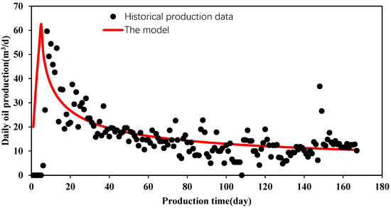 To validate the accuracy of the proposed model, comparative validations were conducted with the real historical production data and the predicted data of our model. The parameters from the reservoir and fracture parameters of an UDCR oil well A in the Tarim Basin used for simulation are listed in Table 1. As we can see in Figure 2, the data predicted by the model can match the real-life data for well A.