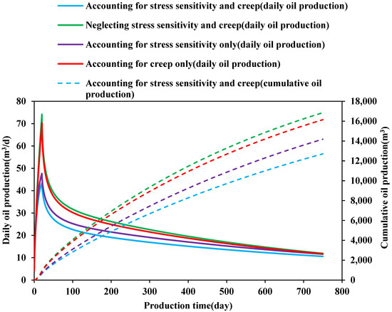 Effect of stress sensitivity and creep on the daily production and cumulative production of UDCR oil wells.