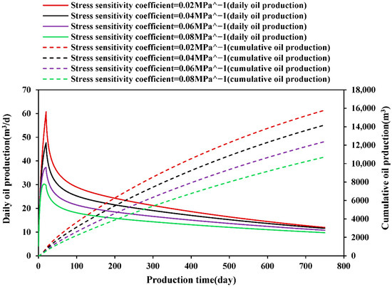 Effect of stress sensitivity coefficient on the daily production and cumulative production of UDCR oil wells.