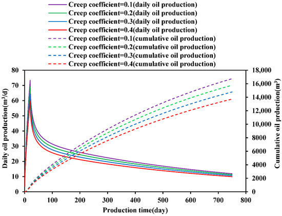 Effect of creep coefficient on the daily production and cumulative production of UDCR oil wells.