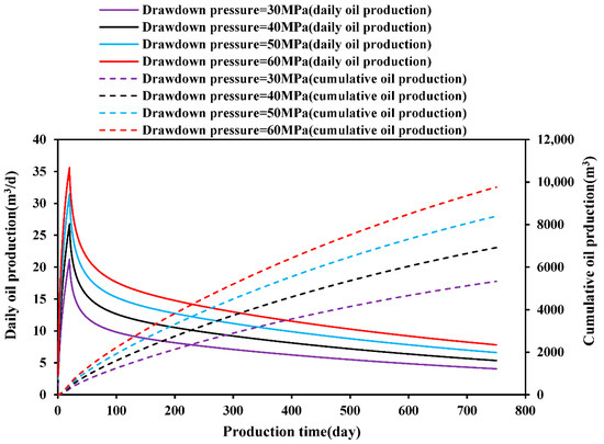 As can be seen from Figure 7, with the increase in drawdown pressure, the increase in daily production in the early stage becomes larger, but the duration is shorter. This is because the drawdown pressure plays a leading role, and differential pressure drive is the key production mechanism. Compared with other sensitivity analysis results, it can be seen that under the same conditions, the drawdown pressure has the greatest impact on productivity. When the drawdown pressure increases from 30 MPa to 60 MPa, the cumulative production growth rate decreases by 13.4%. Drawdown pressure is a key control parameter for oil well production. Larger drawdown pressure enhances stress sensitivity and creep, resulting in a reduction in permeability and oil well production (in this case, the negative impact of creep and stress sensitivity on output has not exceeded the positive impact of the drawdown pressure on productivity).