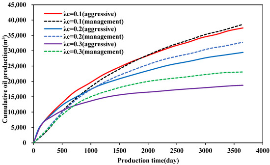 As can be seen from Figure 8, in the early production stage, the cumulative oil production for the three creep coefficients is higher than that under controlled-pressure production. However, as production progresses, a production reversal occurs. This is because the pressure difference in the early stage plays a leading role, and the pressure difference in pressure-release mode is greater than that of pressure-controlled production, so the oil production is higher. However, as production time increases, the negative impact of creep and stress sensitivity on productivity in the pressure-release production mode is more significant, exceeding the positive impact of the pressure difference on productivity, resulting in a reversal of the controlled-pressure production. The creep coefficients are 0.1, 0.2, and 0.3. Compared to the released-pressure model, the increase in cumulative production for the pressure-controlled model is 3.1%, 11.2%, and 23.1%, respectively. This indicates that the larger the creep coefficient, the more pronounced the effect of pressure-controlled production. In other words, the higher the creep coefficient, the more beneficial it is to employ pressure-controlled production.
