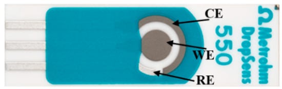 In all experiments, DS550 disposable screen-printed electrodes (DropSens, Llanera, Spain) were used. According to the DropSens website, these electrodes are manufactured on a ceramic substrate with dimensions of 33 mm in length, 10 mm in width, and 0.5 mm in thickness. The electrochemical configuration includes a circular platinum (Pt) working electrode (WE) with a 4 mm diameter, a curved Pt counter electrode (CE), a small, curved silver (Ag) reference electrode (RE), and a silver electrical contact, as illustrated in Figure 1. The Pt working electrode was chosen for its outstanding stability and superior sensitivity to electrochemical reactions [32].