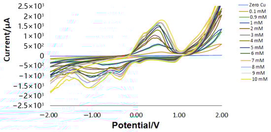 Cyclic voltammetry was performed to determine the oxidation potential of copper. The results indicated a shift in the oxidation peak compared to the baseline (zero reading) after introducing the copper sample, with the oxidation current increasing as copper concentration rose. Figure 2 presents the cyclic voltammetry results for different copper concentrations. Deionized (DI) water served as the baseline measurement, representing zero copper content.
