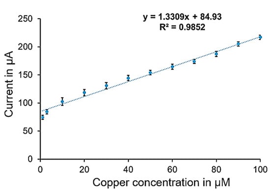 The sensor calibration curves (Figure 3 and Figure 4) were created using current values corresponding to various copper concentrations, ranging from 1 µM to 10 mM, measured through amperometry at voltages determined by cyclic voltammetry. These current values were recorded during the period when the signal stabilized, typically within 5 to 10 s. The stable readings within a defined range were averaged; the average current at zero copper level is around 1.3 μA with a standard deviation (stdv) of 0.1 μA. Two calibration curves were developed: one for lower concentrations (1 µM to 100 µM) and another for higher concentrations (0.5 mM to 10 mM). The calibration curves represent the average readings from six electrodes under consistent conditions.