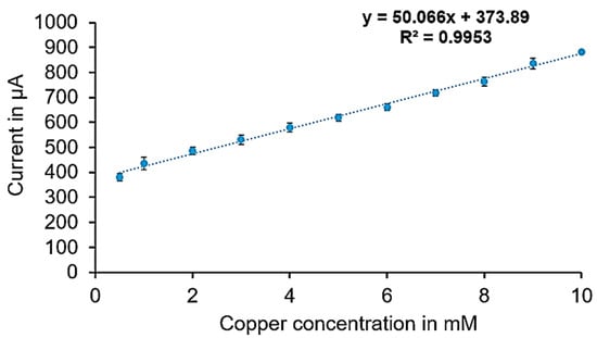 The sensor successfully detected copper ions across a broad concentration range (1 μM to 10 mM), achieving a detection limit as low as 0.001 μM. The calibration curve displayed excellent linearity and high sensitivity, as reflected by the steep slope. A consistent linear correlation was maintained between the measured current and copper concentration over both low and high ranges.