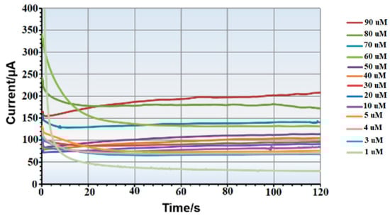 Example of amperometry results of copper samples across concentration range of (1 µM to 90 µM).