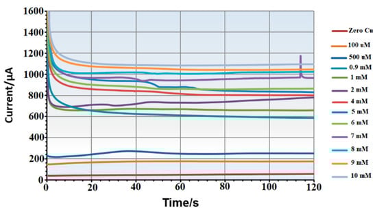 Example of amperometry results of copper samples across concentration range of (0 mM to 10 mM).