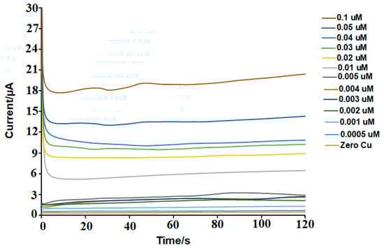 Prior to each experiment, the electrodes were thoroughly rinsed with DI water and allowed to air-dry at room temperature. The liquid samples were prepared according to the procedure described in Section 2.5. To establish a baseline, 100 µL of DI water was placed on the electrodes. The voltage was set based on the cyclic voltammetry results, and amperometry was conducted for 120 s to measure the current corresponding to zero copper concentration.
