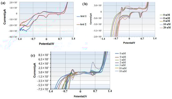 Initially, 100 µL of the heavy metal complex was applied to the electrode surface, and CV measurements were recorded over a potential range of −1.4 V to 1.4 V. The absence of a peak at 0.6 ± 0.05 V indicated that none of the metals in the complex were electroactive at this potential (Figure 8a).
