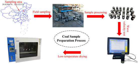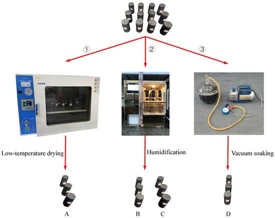 Consequently, the prepared coal samples were subjected to treatments corresponding to the three states, as depicted in Figure 3. In Scheme A, the samples were subjected to low-temperature drying at 40 °C for 6 h and removed for UCTs, which were used to simulate the coal body in region ①. In Schemes B and C, the samples were placed in a non-destructive soaking device independently developed by the China University of Mining and Technology for natural water absorption for 8 h and 16 h, respectively, and then subjected to UCTs to simulate the coal body in region ② [32]. In Scheme D, the samples were placed in vacuum-purified water for 24 h and then subjected to UCTs to simulate the coal body in region ③ after wiping off the surface water with absorbent paper. All coal samples were treated using four schemes and tested for wave velocity using a wave velocity meter (RSM-SY6 acoustic monitor, manufactured by Hebei Tianqixingzi Testing Equipment Co., Ltd. in Cangzhou, China) before starting the test. Table 1 lists the sample numbers and basic physical parameters.