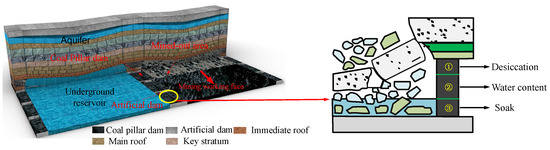 Coal resources, as the primary energy source in the current energy consumption structure of China, have always been the focus of research by experts at home and abroad to secure their safety and stability during mining and sustainable development of the eco-environment in mined areas [1]. After mining, the overburden collapses, the aquifer is destroyed, and the groundwater vertically flows into the goaf, forming a place where the groundwater source is gathered with the boundary and section coal pillars as the dam [2,3]. Groundwater resources are gathered in the goaf, with periodic fluctuations in water levels, exerting long-term water erosion on coal pillars. According to previous studies, water weakens the physical and mechanical attributes of coal rock masses, reduces their bearing strength, and makes them easier to deform and destabilize [4,5,6]. When coal pillars collapse under water erosion, a large amount of groundwater gushes into the quarry, wasting water resources and seriously threatening the safe production of the quarry [7,8].