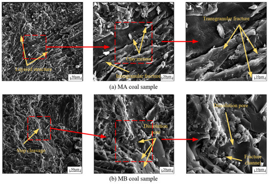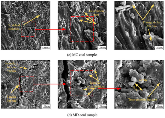 As shown in Figure 4a, the surface of the dry MA coal sample was rough, featuring abundant depressions and protrusions, and displayed a layered accumulation. This structure results in a large specific surface area, which is advantageous for liquid adsorption. At a magnification of 1500×, intergranular cracks were apparent. Furthermore, at higher magnifications, a small number of transgranular cracks within the coal matrix can be observed.
