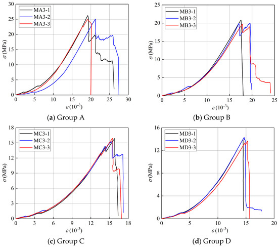 Figure 6 indicates that the stress-strain diagrams for the four groups of coal samples under varying treatments were dominated by brittle damage after the peak. No obvious stress drop was noticed in the pre-destruction curves of the dry samples in group A and the soaked samples in group D. In contrast, an obvious stress drop was observed in the water-containing samples in groups B and C. This was mainly due to the different moisture contents of different regions in the natural water absorption process, leading to different strengths in each region. The loading process was prone to stress drops. However, the water distribution in the soaked samples was more uniform, and the regional strength gap was smaller, making it difficult to observe a stress drop. The stress-strain curves in the same group exhibited higher coupling and better homogeneity.