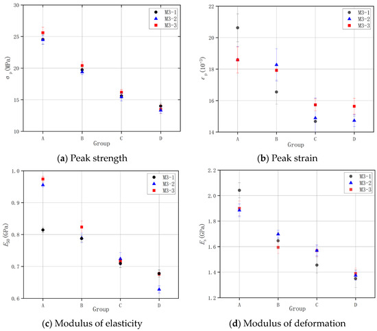Figure 7 presents the strength and deformation parameters for the four groups of coal samples, from which it is clear that the peak strength, peak strain, elastic modulus, and deformation modulus declined with increasing water erosion duration. Comparing the mechanical parameters of samples from groups A, B, and C, it was observed that with increasing moisture content, the mechanical parameters progressively declined, which was the same as the conclusion of previous research. Comparing the mechanical parameters of the samples saturated by natural water absorption from group C and those saturated by immersion from group D, it was found that the samples from group D had lower parameters. This is because long-term immersion caused the loss of some water-soluble minerals in the samples, resulting in initial damage and accelerating the destruction of the coal samples under external force. This suggests that, compared with naturally absorbed coal samples, the long-term soaked ones were easier to destabilize and damage under external load. Therefore, reinforcement is required for this part of the coal body in the support design of the underground reservoir dam.