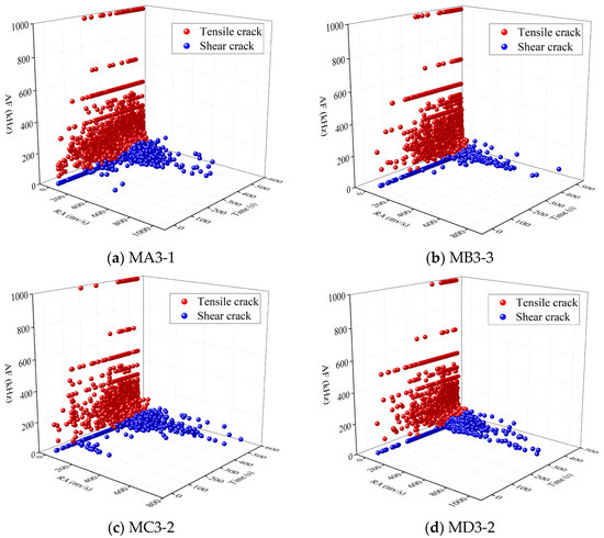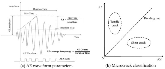 Different types of microcracks were generated in rock units under tensile and shear stresses, and the differences in the mechanism of microcrack generation led to the release of different AE waveforms during formation. Generally, the AE waveforms released by tensile cracks have a high frequency and short rise time, in contrast to shear cracks [37,38,39,40]. Therefore, defining the AE characteristic parameters allowed a microscopic distinction between tensile and shear cracks. Figure 9 shows that tensile cracks exhibited high AF and low RA, in contrast to shear cracks; however, there was still no clear definition for the demarcation line. Therefore, it is necessary to introduce new algorithms for quantitative analysis.