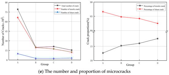 According to Table 3 and Figure 10e, as the moisture content increased, the sum of the cracks, tensile cracks, and shear cracks gradually decreased. This was mainly because water weakened the varying mechanical parameters of the coal body, leading to initial damage, while dry coal masses required massive cracks during loading and accumulated sufficient damage to cause strength instability. A gradual decline in the percentage of tensile cracks and a gradual increase in shear cracks were observed. Comparing the shear crack classification results of varying pretreated coal samples, it was indicated that there was a large difference in the percentage of shear cracks between dry coal samples (group A) and water-unsaturated coal samples (group B), which was 1.59%. In contrast, there was a small difference in the percentage of shear cracks between the water-unsaturated (group B) and water-saturated (group C) coal samples under natural water absorption, which was 0.08%. There was a large difference in the percentage of shear cracks between the naturally absorbed water-saturated coal samples (group C) and vacuum-soaked water-saturated coal samples (group D), which was approximately 2%. Therefore, different water erosion methods affected the generation of microcracks during the damage failure process. Shear cracks were more likely to be generated by soaking water absorption than by natural water absorption. Under the same water erosion conditions, a higher moisture content is more likely to induce shear cracks.